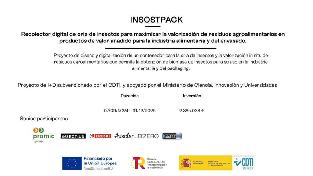 El objetivo de INSOSTPACK es diseñar y digitalizar un container para la cría de insectos y la valorización in situ de residuos orgánicos, generando biomasa que pueda aplicarse tanto en la industria alimentaria como en la fabricación de envases sostenibles.