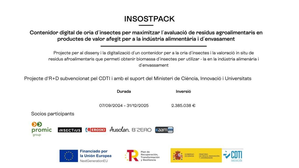 L’objectiu d’INSOSTPACK és dissenyar i digitalitzar un contenidor per a la cria d’insectes i l’avaluació in situ de residus orgànics, a fi de generar biomassa que es pugui aplicar tant en la indústria alimentària com en la fabricació d’envasos sostenibles.